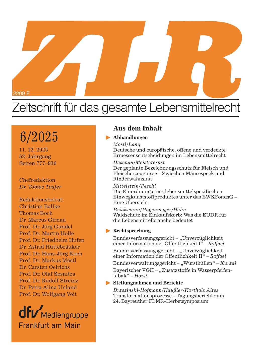 Der Tagungsbericht zum 24. Bayreuther FLMR-Herbstsymposium mit dem Titel "Transformationsprozesse" ist in der Zeitschrift für das gesamte Lebensmittelrecht erschienen (Brzezinski-Hofmann/Häußler/Korthals Altes, ZLR 2025, 924-933).